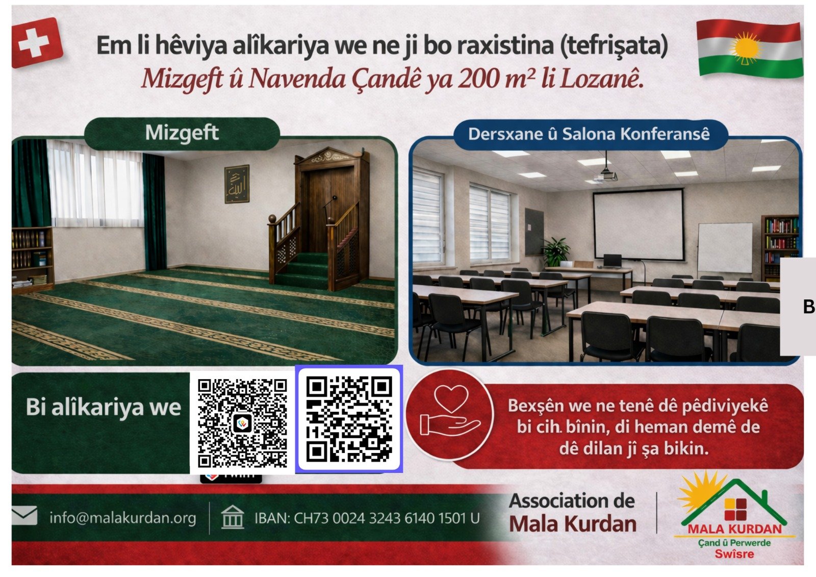 Di navenda me de li Lozanê, em dixwazin mizgeft û salonê konferansê li ser qada 200 m² ava bikin. Ev cîh dê bibe navendek ji bo îbadet, perwerde, civîn û çalakiyên civakî.
